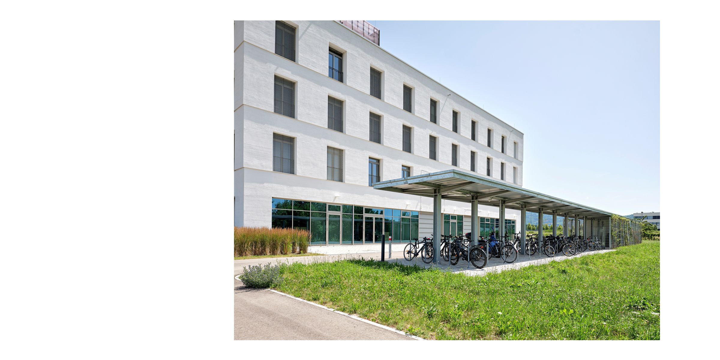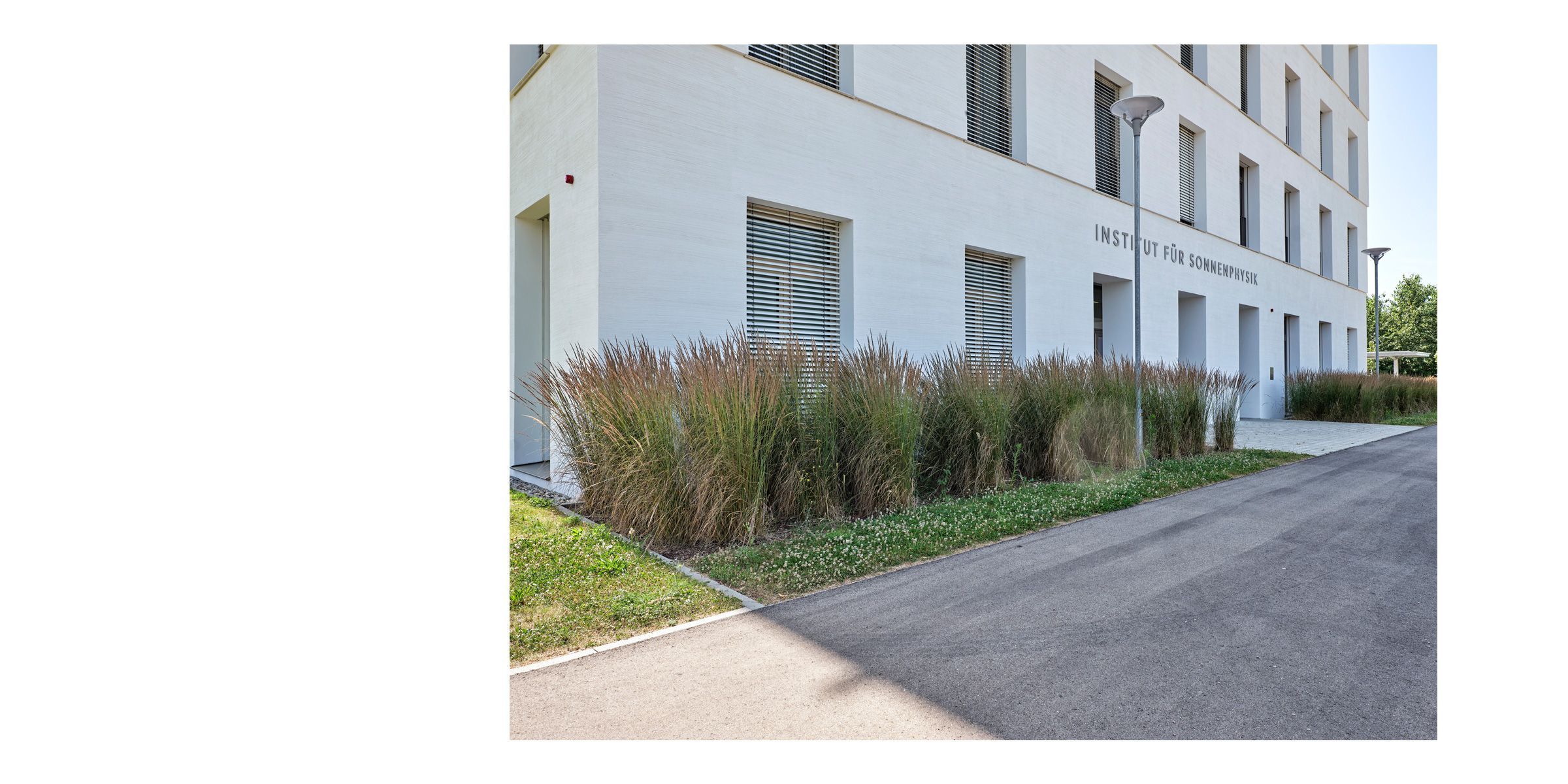 Die Haupterschließung auf das Grundstück KIS verläuft westlich des Neubaus und führt den Asphaltbelag aus der Uni- Erschließungsstraße Nord fort.